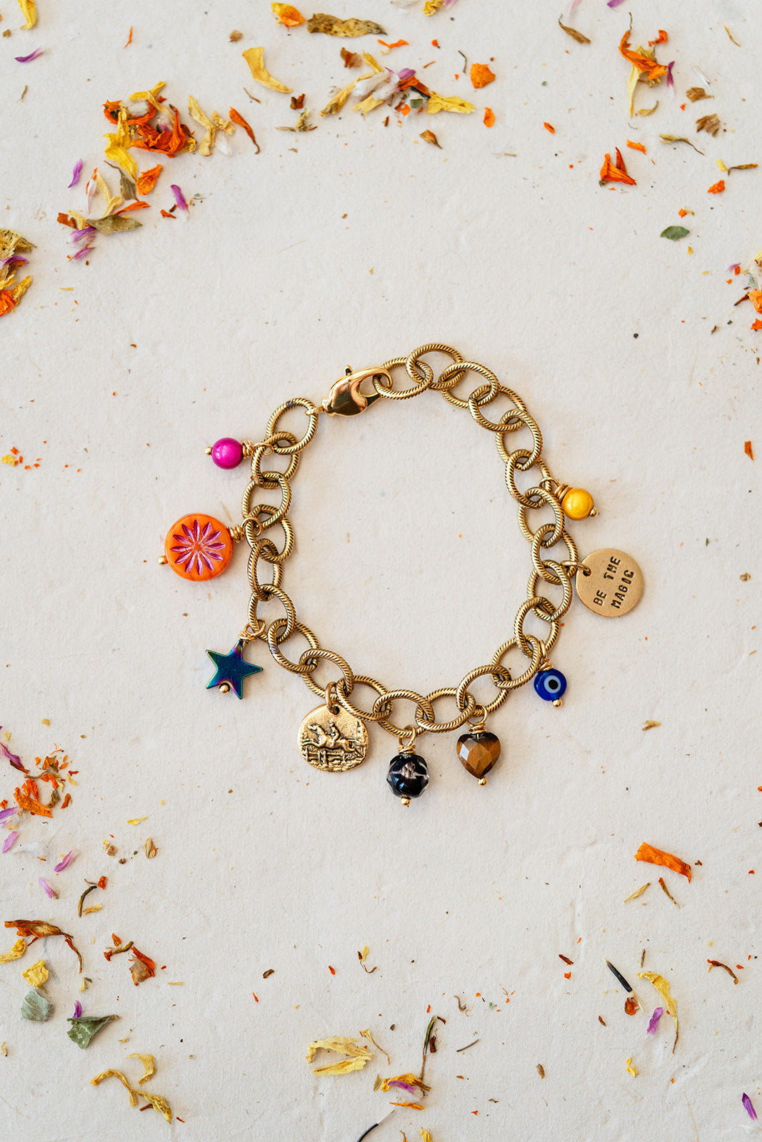Designed to be worn daily, the Everyday Magic Charm Bracelet – Year of the Horse is a thoughtfully curated piece that brings intention, symbolism, and a little magic into the everyday. This gold-plated charm bracelet features an unexpected mix of meaningful charms and rich materials, including a horse charm representing strength, freedom, and forward momentum.