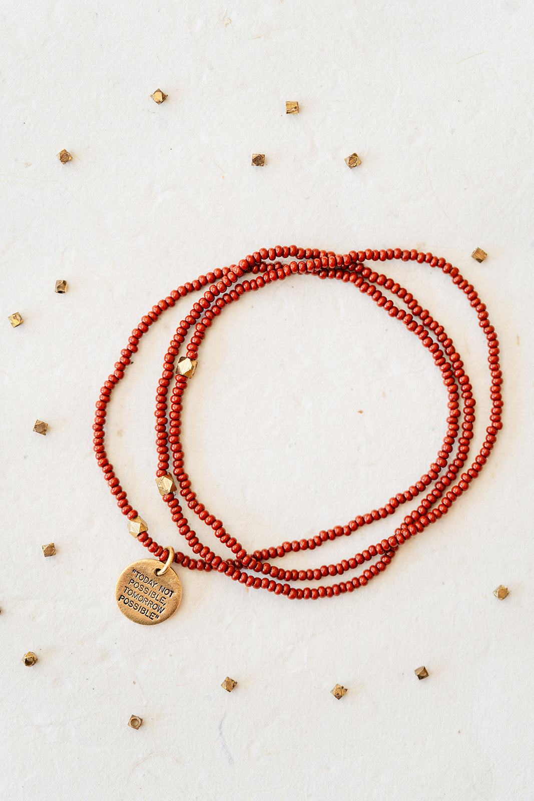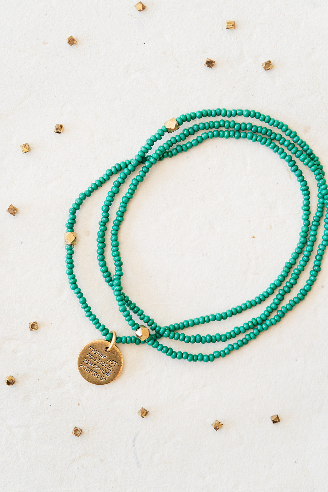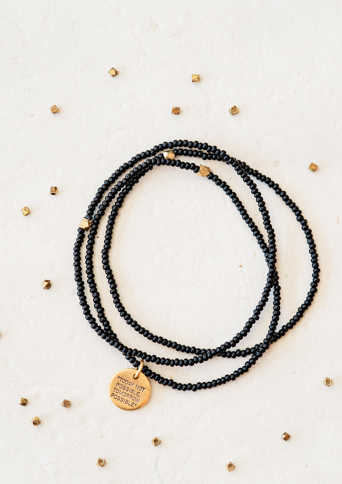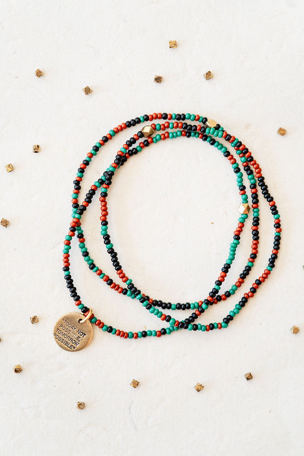 Stamped with the inspiring phrase “Today Not Possible, Tomorrow Possible,” this seed bead bracelet carries a message of perseverance, growth, and belief in what comes next.
