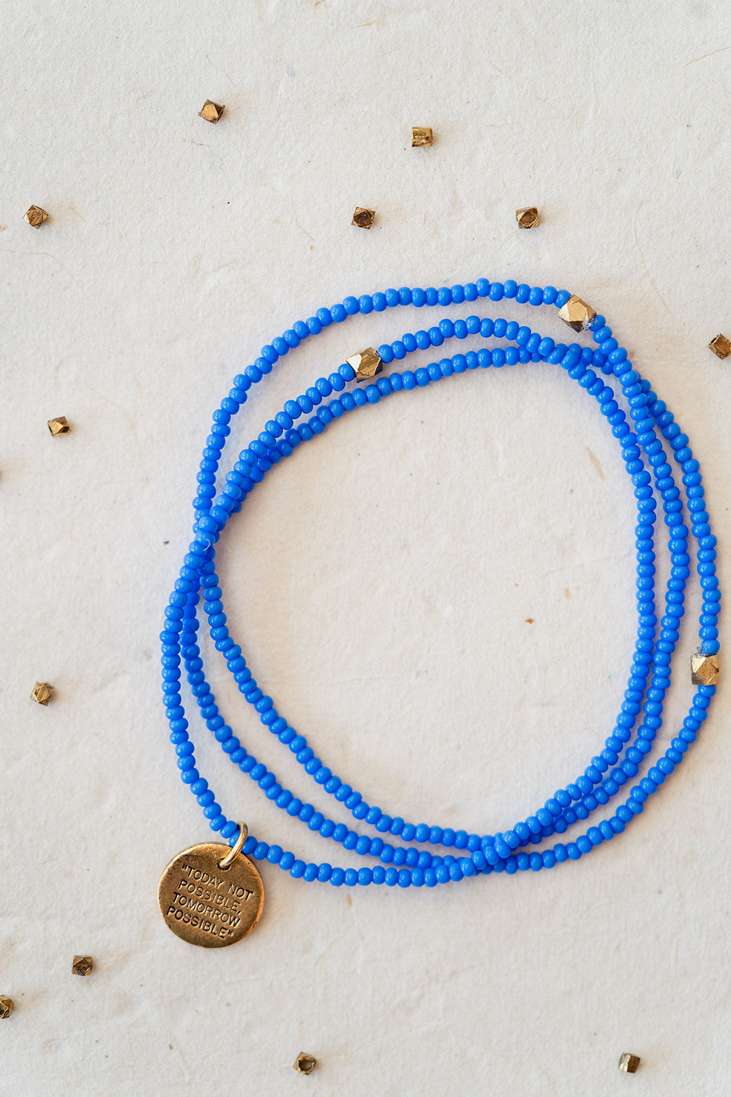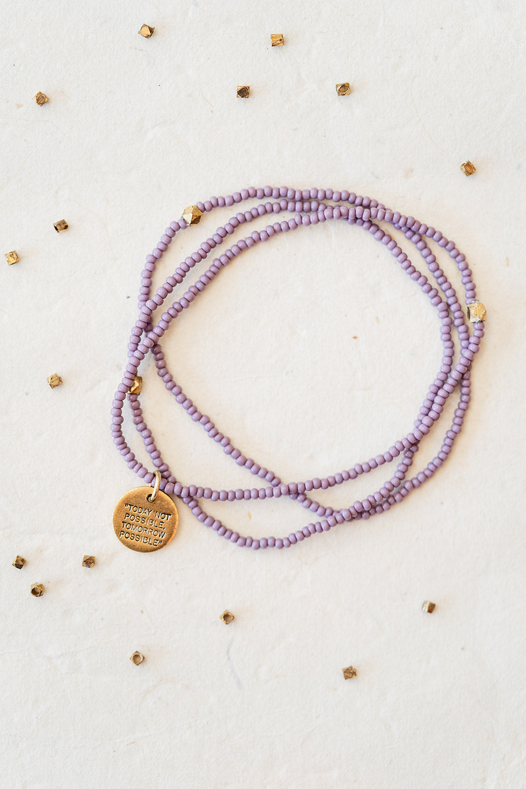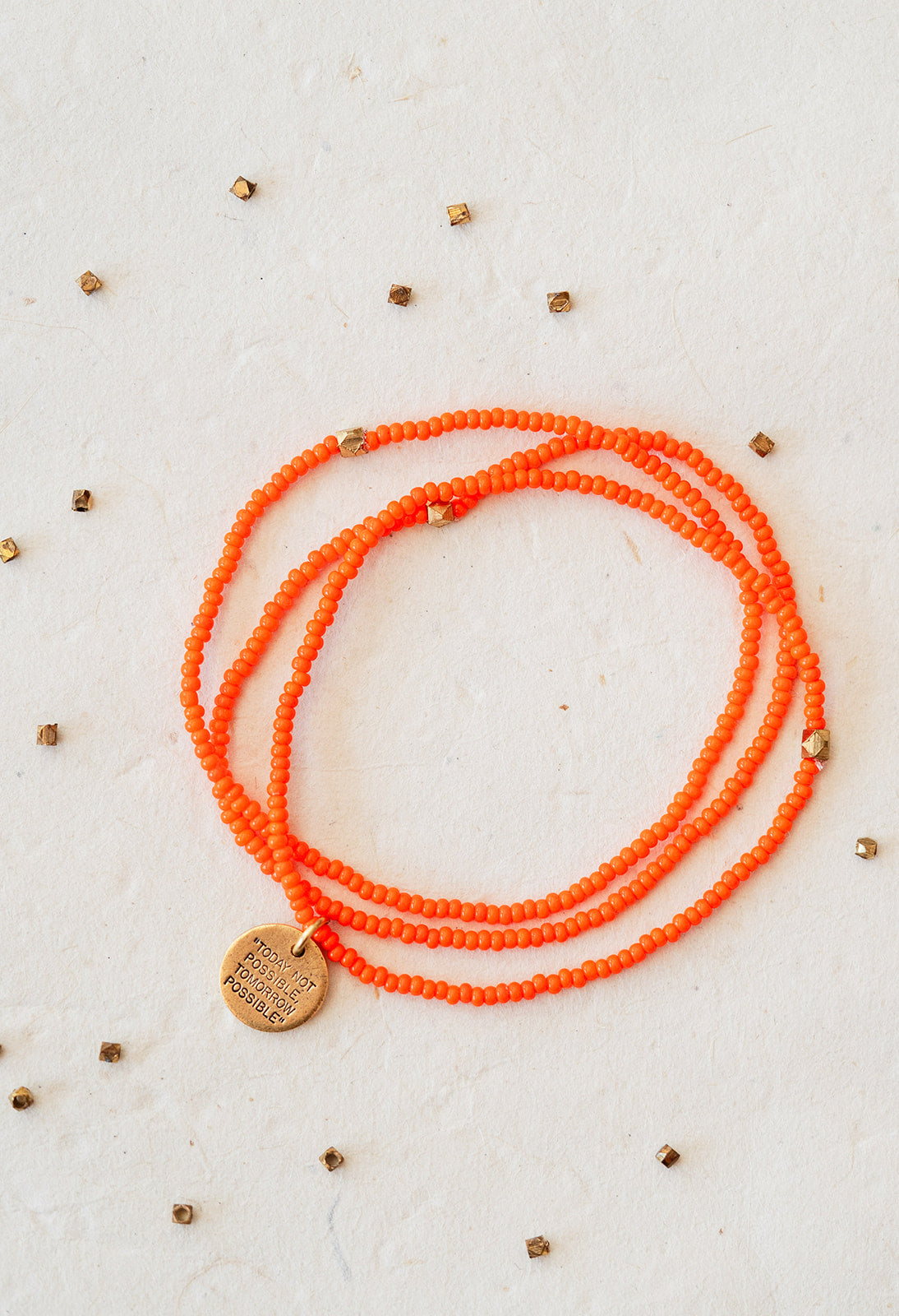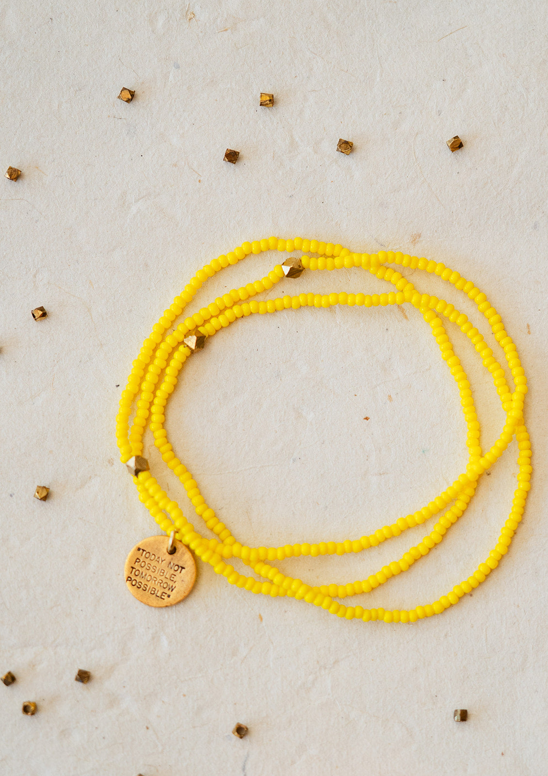 Stamped with the inspiring phrase “Today Not Possible, Tomorrow Possible,” this seed bead bracelet carries a message of perseverance, growth, and belief in what comes next.