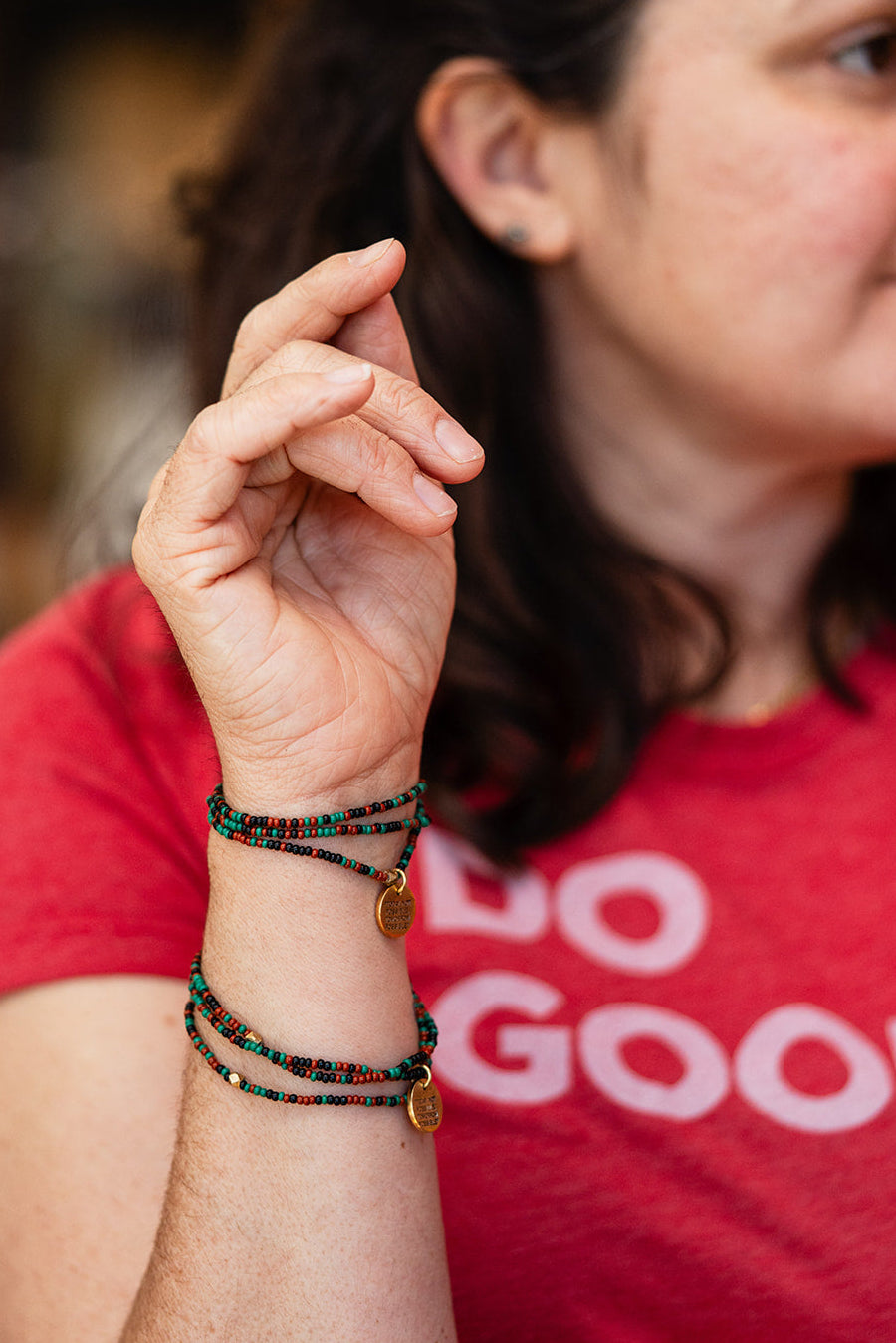 - Roll bracelets gently onto your wrist — avoid overstretching